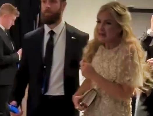 chairwoman Erika Kirk leaving the White House Correspondents’ Association Dinner on April 25, 2026, visibly upset.