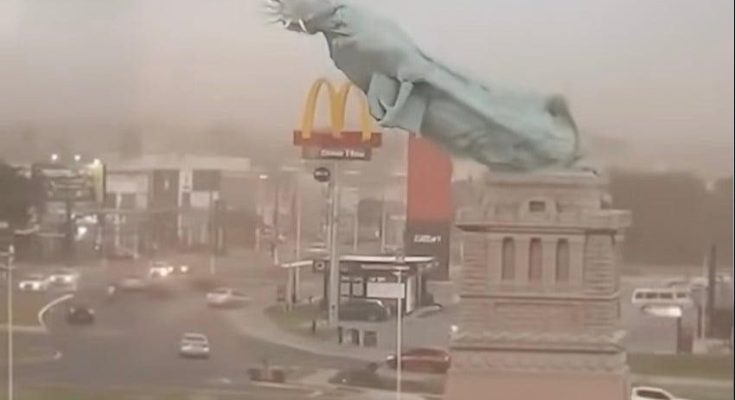 A powerful storm swept through the area late Tuesday night, toppling a massive 115-foot replica of the Statue of Liberty and leaving residents stunned by the scale of the destruction. Fierce winds and heavy rain battered the landmark for hours before it finally gave way, collapsing onto nearby grounds as emergency crews rushed to secure the scene. No injuries were immediately reported, but authorities said the damage was extensive.