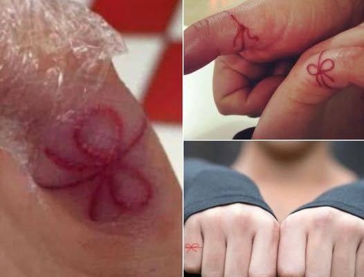 So I did a little digging – thanks, internet – and found that the red string tattoo in question is known in Asian cultures as the ‘red string of fate’. Most commonly appearing on the thumb of a man and the pinky finger of a woman, the tattoo looks like a simple bow with tails, not unlike a tied shoelace.